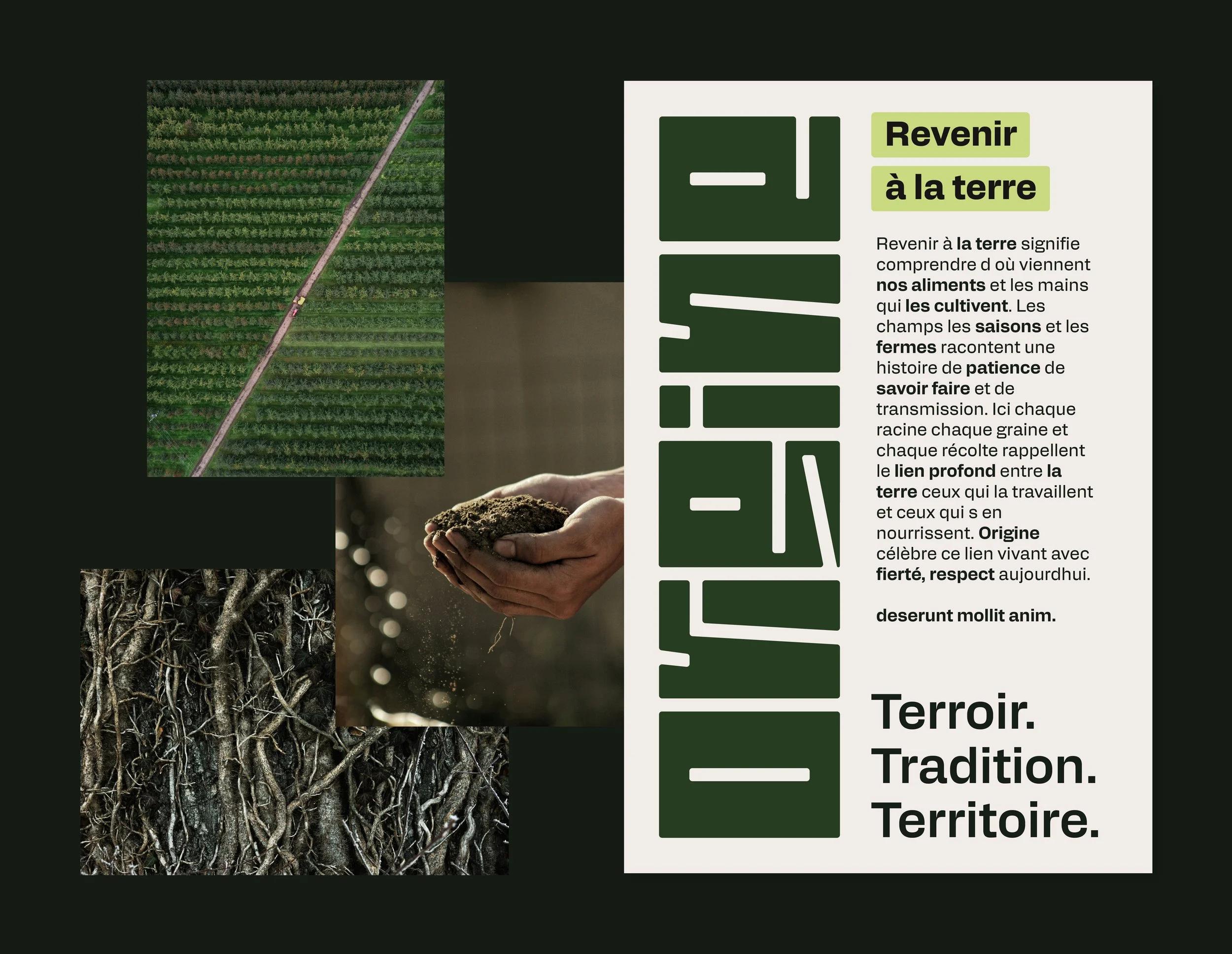 The concept centers on roots and connection to the land. Bold wordmarks represent the soil, while the negative space between the letters forms a system of roots growing underneath. This interplay between solid and empty, surface and underground, is built directly into the structure of the type. It keeps the brand grounded in its subject without falling into the expected imagery of the category.